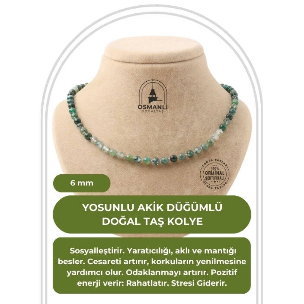 TÜM TAŞLARIMIZ SERTİFİKALI ve %100 ORJİNAL GERÇEK DOĞAL TAŞTIR. Doğal taş takılarının bu eşsiz güzelliği ve faydalarıyla müşterilerimize en kaliteli ve en özel takıları sunuyoruz. Her bir takı, tasarımcılarımız tarafından özenle hazırlanmış, doğal taşların renkleri ve enerjileri ile birlikte, size en uygun olanı seçmenizi sağlar. Doğal taş takılarımız, herhangi bir moda stiline mükemmel bir şekilde uyum sağlar. Aynı zamanda doğanın eşsiz güzelliklerini keşfetmek isteyenler için de harika bir seçenek sunarlar. Kendinizi özel hissetmek istediğinizde, doğal taş takılarımız sizin için mükemmel bir seçenek olacaktır. Ürün İçeriğindeki Taşlar Aşağıda Listelenmiştir. Yosunlu Akik Taşı Özellikleri: Sosyalleştirir. Yaratıcılığı, aklı ve mantığı besler. Cesareti artırır, korkuların yenilmesine yardımcı olur. Odaklanmayı artırır. Pozitif enerji verir: Rahatlatır. Stresi Giderir.